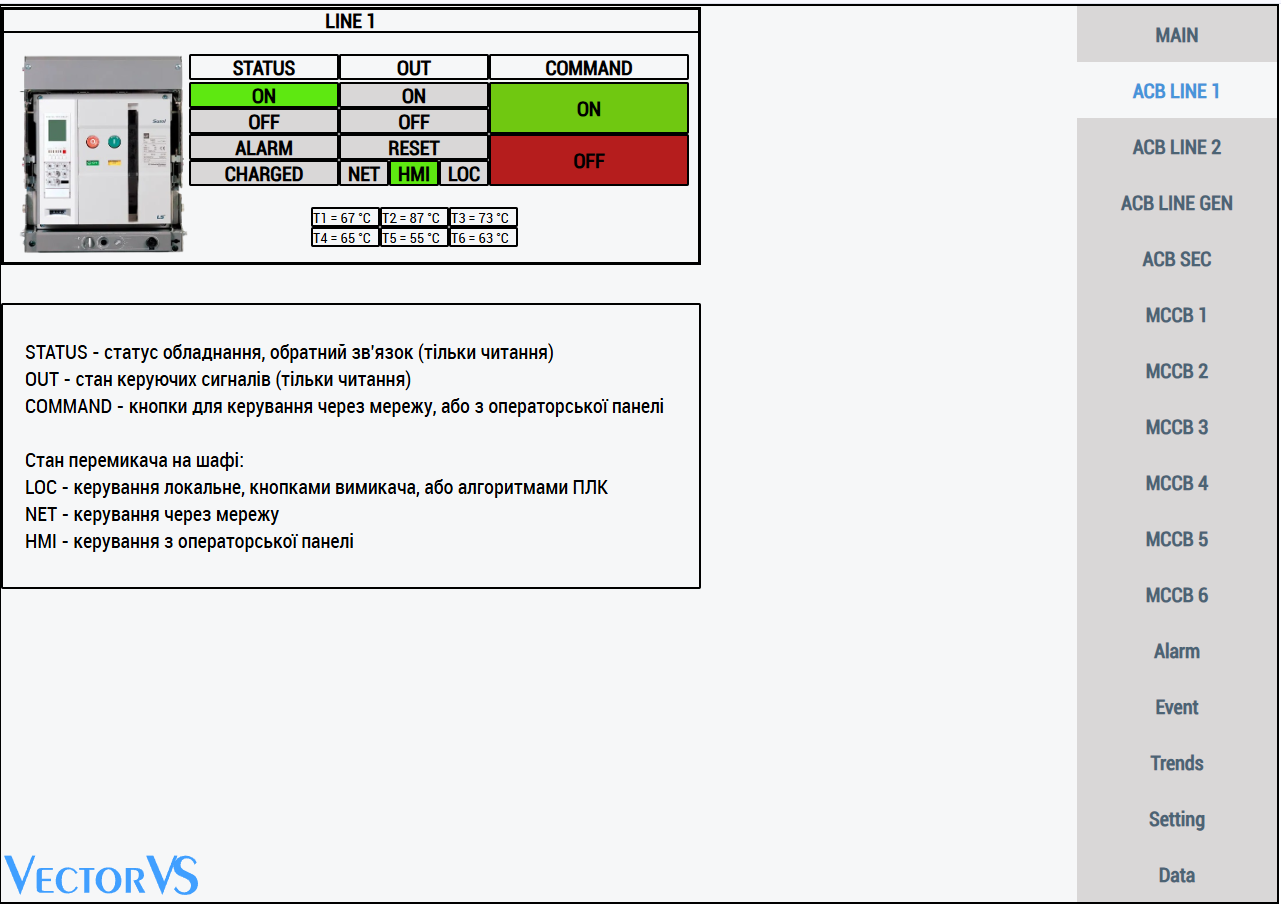 Екрани вимикачів АCB, на ньому відображається стан обладнання, з цього екрану є можливість дістанційного керування вимикачем з панелі оператору або по мережі.