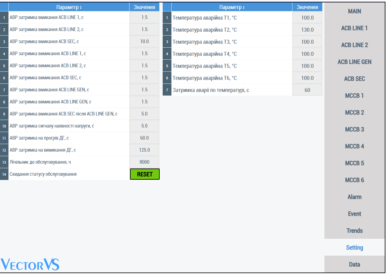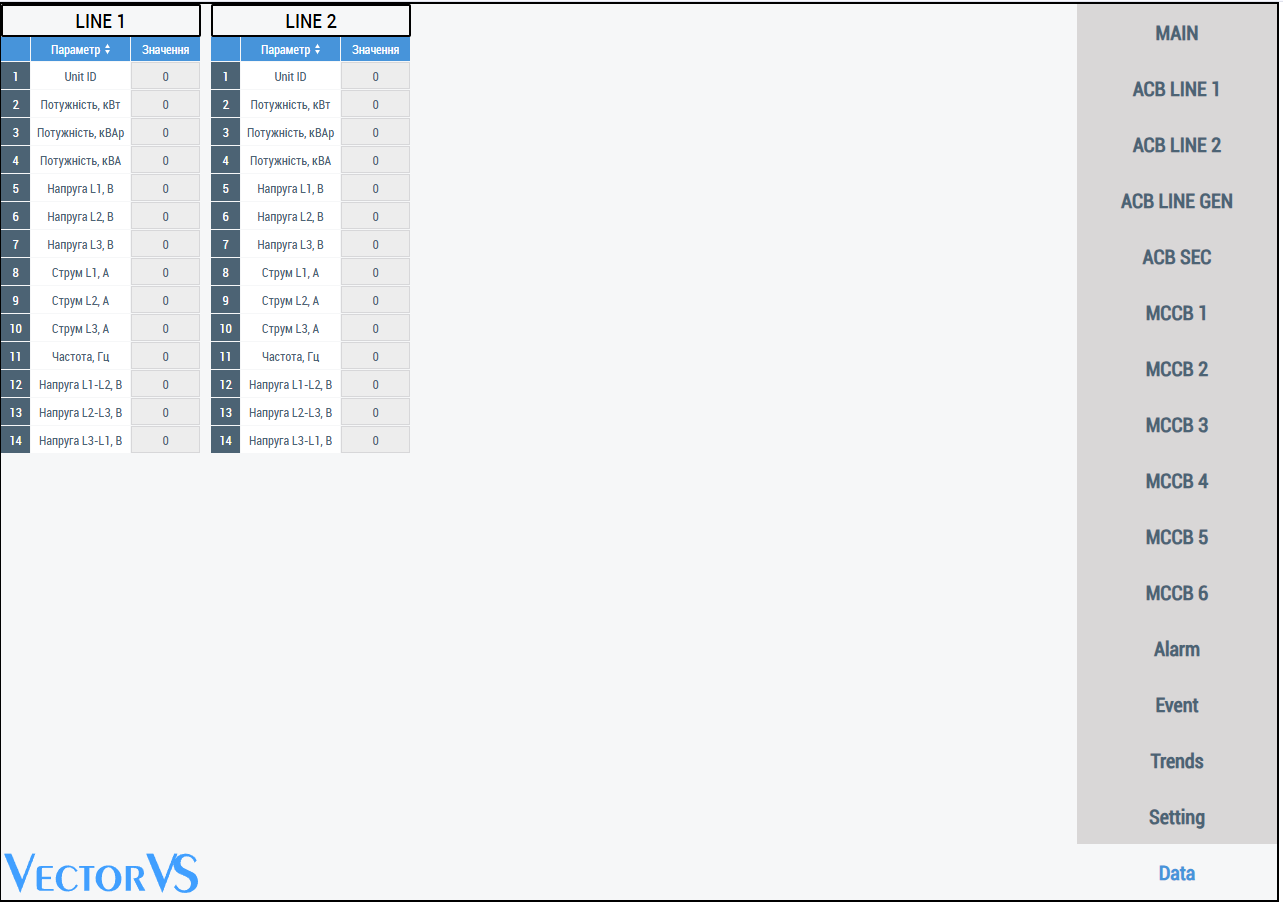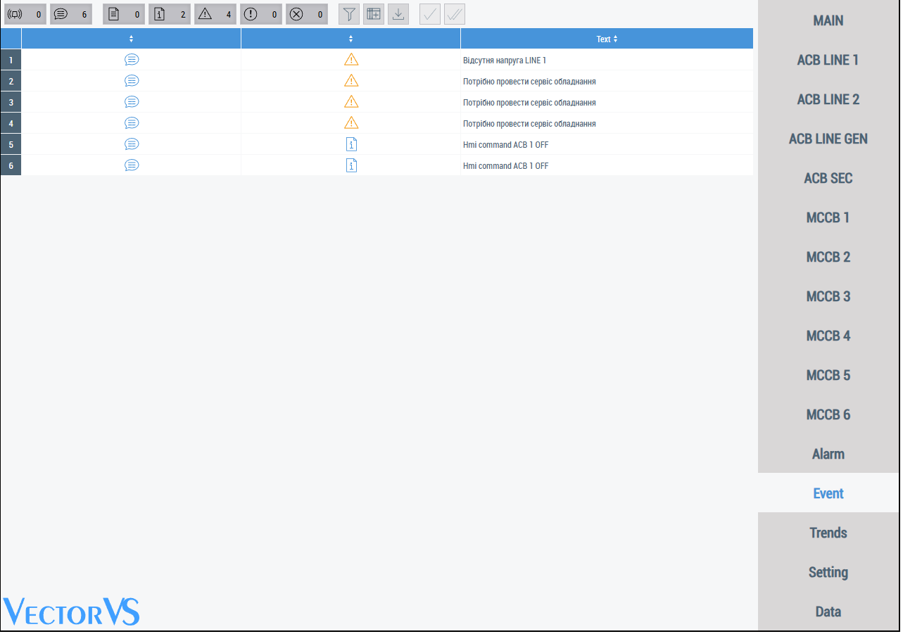 Екрани вимикачів MCCB, на ньому відображається стан обладнання, з цього екрану є можливість дистанційного керування вимикачем з панелі оператору або по мережі. Опційно є можливість встановлення додаткового аналізатору мережі та відображення з нього даних. Екран аварій, на ньому відображаються аварії, час виникнення та час зникнення аварії.